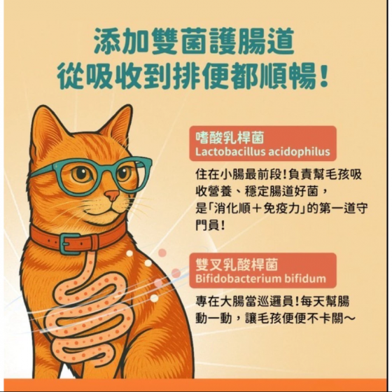 營養成分及含量:蛋白質 37% ↑、脂肪136↑、纖維4.5%↓、水分10%↓、鈣1.1%↑、磷0.7% ↑、牛磺酸0.15% ↑ 熱能 374 Kcal/100g