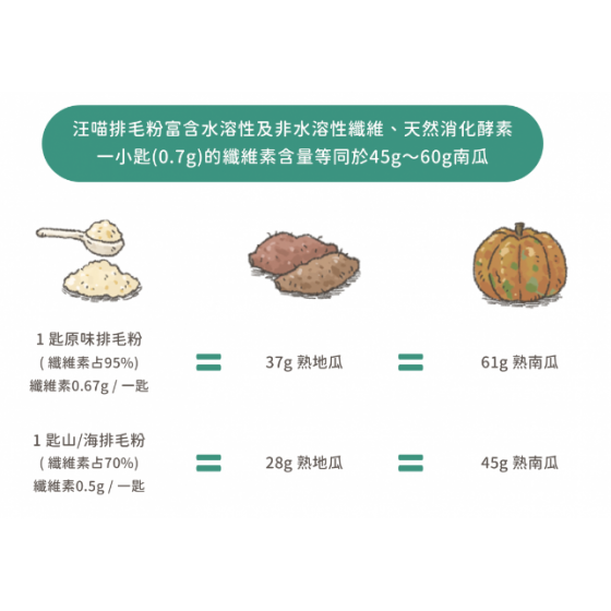 排毛粉:成分天然,僅添加洋車前子&菊苣纖維與日本頂級天野酵素以及好的油脂(魚油、亞麻仁油)。