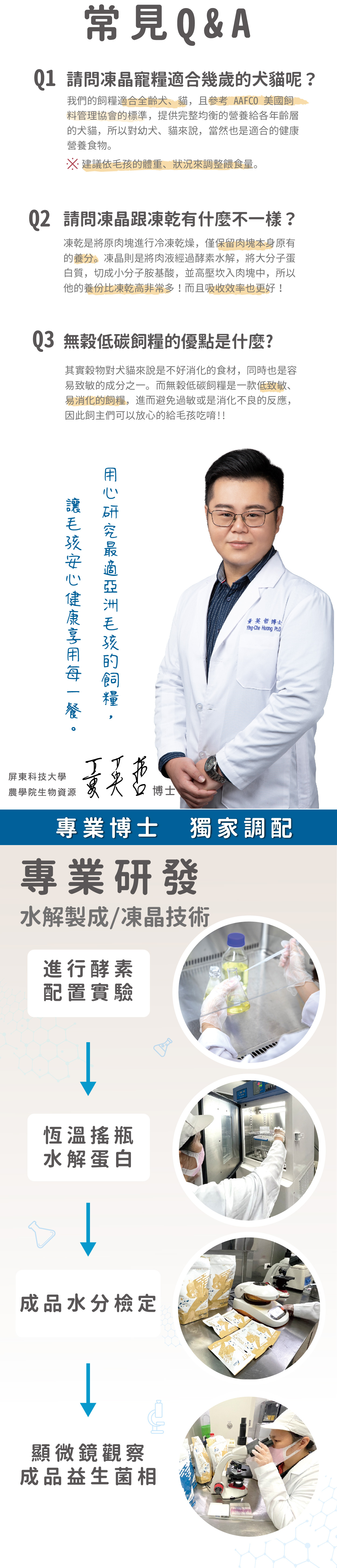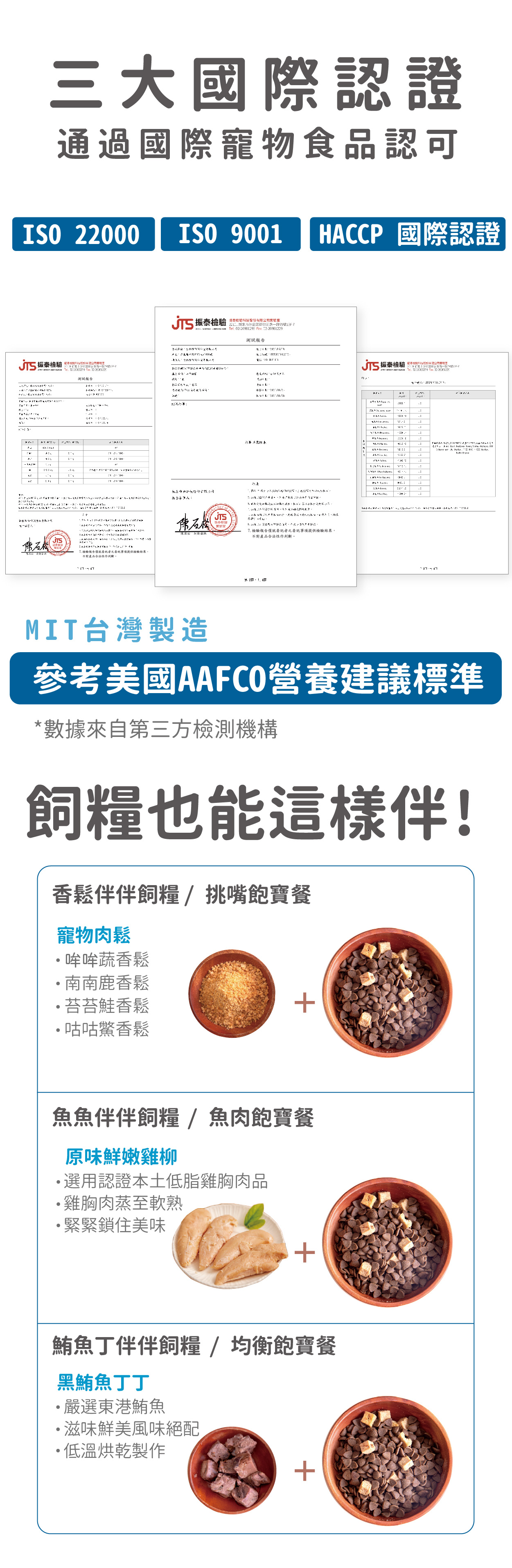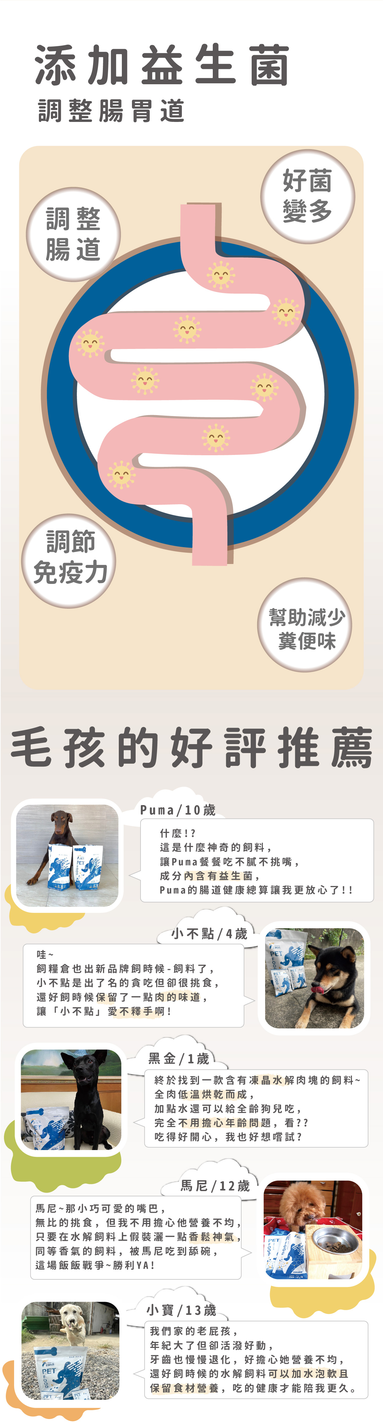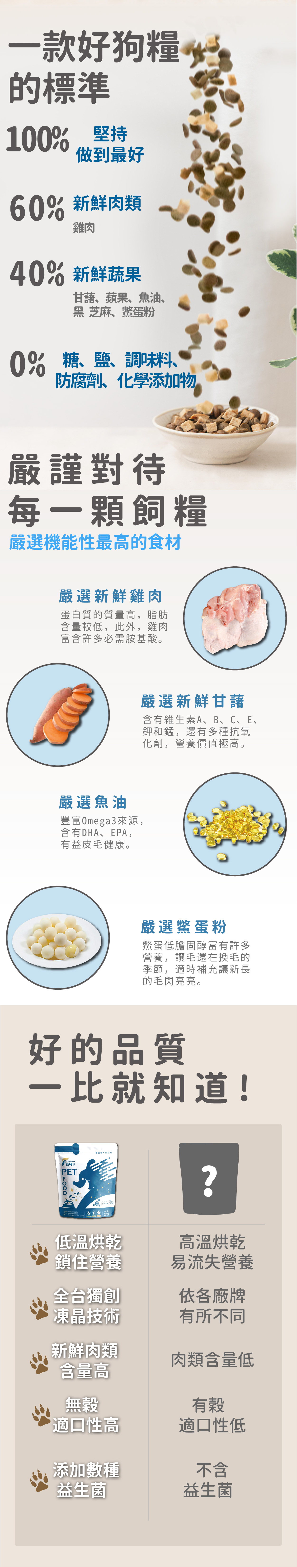 新鮮雞肉、甘藷、發酵胜肽蛋白、鱉蛋粉、發酵深海魚粉、深海魚油、蘋果纖維、低乳糖奶粉、黑芝麻、膠原蛋白、酵母粉、水溶性纖維、耐高溫芽孢乳酸菌、納豆菌、絲蘭萃取物、泛酸鈣、膽鹼、維生素E、維生素A、β-胡蘿蔔素、卵磷脂、維生素(B1、B2、B6、B12、D)、維生素C、蛋胺酸、胱胺酸、生物素H(B7) 、酵母硒、牛磺酸、有機鋅、泛酸、葉酸、銅、鐵、錳、碘、鈷、硼、錫、釩、钼、鈦、鎂、矽