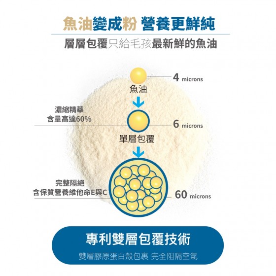 木入森魚油粉,有別於傳統魚油膠囊,是更適合貓咪狗狗的 Omega-3 營養來源,不只無腥味、適口性更高,餵食方便,專利「雙層包覆技術」還能完整新鮮保存魚油營養。