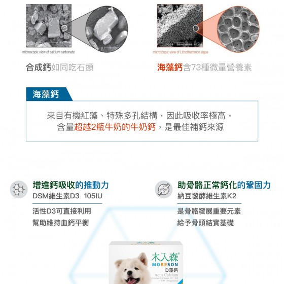 木入森《犬寶D藻鈣》選用 Aquamin F 愛爾蘭海藻鈣,足量每日強健需求 585mg,來自有機紅藻,特殊多孔結構,吸收率極高,含量超越 2 瓶牛奶的牛奶鈣,是最佳的補鈣來源。