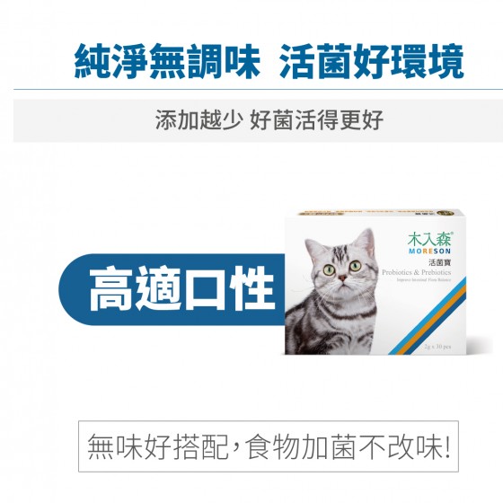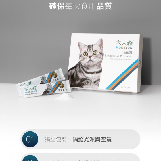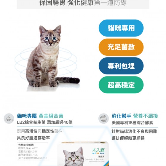 木入森貓咪活菌寶,給予貓咪專屬 LB2 綜合益生菌,有效調整細菌叢生態,搭配優質益生菌能源(半乳寡糖、果寡糖、水溶性膳食纖維),增進腸內菌叢品質,促進腸胃蠕動,使排便穩定正常,並使用美國專業 18 種類型綜合酵素,針對貓咪飲食,幫助消化。
