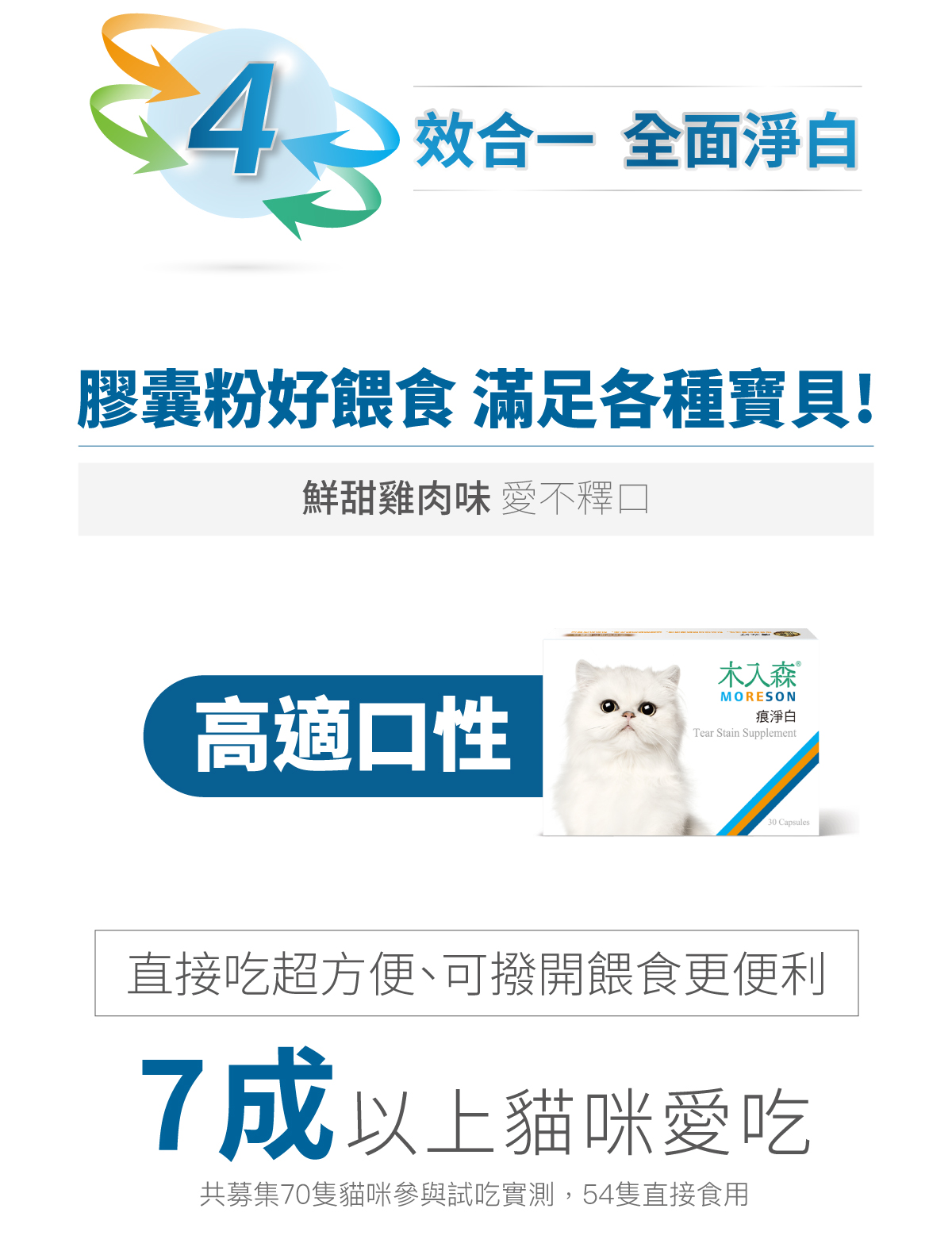 木入森 貓咪痕淨白,全面 4 大淨白營養,對付多重流淚原因,顧及眼睛、鼻子、免疫、菌源 4 重守護,具備強效抗氧化力,化減眼污累積,幫助呼吸順暢並助敏感舒緩。成分據研究證實,可幫助克服色素累積,達到淨白效果。