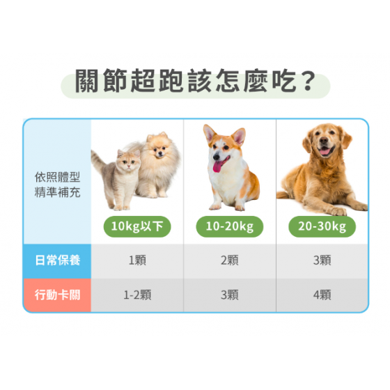 Q1:UC-II 跟葡萄糖胺、軟骨素差在哪裡? UC-II 屬於非變性第二型膠原蛋白,臨床研究顯示比傳統葡萄糖胺和軟骨素更容易吸收且效果更穩定。 嬌寵醫生關節超跑採用專利 UC-II 並搭配MSM、褐澡醣膠完整足劑量配方。 Q2:貓狗開過關節刀後可以吃關節超跑嗎? 可以!手術後更需補充足夠關節保健品來幫助骨關節及軟骨所需營養,極精萃關節超跑配方足劑量, 用最少成分達到最大功效,是毛孩關節術後保養首選。 Q3:狗狗走路卡卡適合吃關節超跑嗎? 狗狗走路卡卡、蹲下困難、爬樓梯不順等關節退化狀況都適用喔! Q4:貓咪才 5 歲但有折耳貓體質,現在需要吃關節超跑嗎? 像折耳貓、曼赤肯這類天生關節脆弱的品種,建議從5歲起開始進行保養,攝取關節保健品。 Q5:關節超跑可以天天吃嗎?要吃幾顆? 極精萃關節超跑選擇最適合毛孩成分,可以天天吃作為毛孩關節保健補給。 為了達到有效足劑量,請依照毛孩的體重餵食,10KG以下每天1顆,10-20KG每天2顆,20-30KG每天3顆。 Q6:我家毛孩剛滿8歲,想保養關節該選擇魚油還是關節超跑? 魚油富含EPA及DHA,可以舒緩關節不適,對於眼睛、皮膚、心血管也有全面幫助,適合全年齡毛孩身體保健。 關節超跑的三大成分UC-II、MSM、褐澡醣膠則可以幫助關節、軟骨、骨骼的健康及協同運作的靈活度,非常適合初老毛孩每日養護關節。