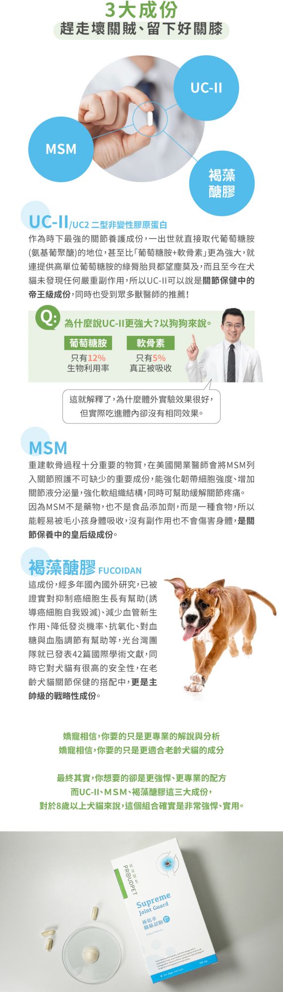 這是一款針對8歲以上老靈犬貓開發的關節保健品先天膝蓋問題的小型品種犬高達29.14%三大成分:UC-II、MSM、褐澡醣膠你要的不是只有最適合老齡毛孩的成分,還有足劑關節退化不可逆,毛小孩什麼時候開始吃產品檢驗嚴格把關]什麼的毛小孩不適用這款品關節超跑該怎麼吃挑嘴貓口飼主適用好評推薦極精萃關節超跑常見問題 Q1:UC-II 跟葡萄糖胺、軟骨素差在哪裡?