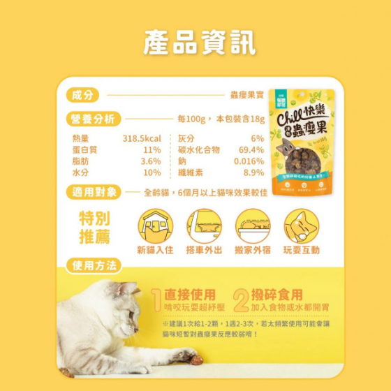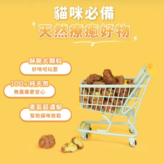 ✔ 100% 純天然 ✔ 質地酥鬆好咬 ✔ 凍乾香氣更濃 ❓有些蟲癭果綠綠的、有黏液是正常的嗎? 🅰️是正常的! 怪獸凍乾蟲癭果由天然植物果實製成,黏液為果實本身的汁液,果實綠綠的、果肉中帶點橘粉色都是正常的。果實為野生摘採無農藥,整顆都能食用,可以放心給貓咪啃咬、玩耍。 ❓使用這個會上癮嗎? 🅰️不會唷! 蟲癭果含有的天然生物鹼會讓貓咪產生興奮、快樂的感受,但不會成癮。 但長時間使用,貓咪可能會反應較弱一陣子,可隔一段時間再給貓咪玩喔。 ❓為什麼我家貓咪沒反應? 🅰️一般建議6個月以上貓咪使用效果較佳,但每隻貓對生物鹼的反應不同,建議可以試試其他類型的紓壓植物(ex:貓薄荷、木天蓼…)。由於蟲癭果是天然植物果實,也可單純作為與貓咪互動、玩耍的玩具唷。