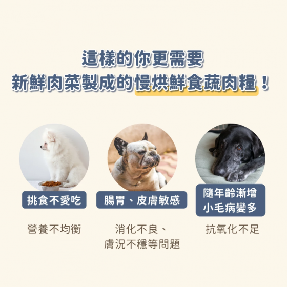 • 慢烘原肉糧+凍乾蔬肉粒,肉菜機能一次滿足!