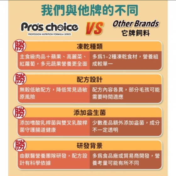 營養乾糧:脫水雞肉、脫水鯷魚、豌豆、馬鈴薯、家禽油脂(維生素E保存)、乾燥甜菜、乾燥海藻 酵母粉、牛磺酸、絲蘭萃取物、卵磷脂、複合益生菌(嗜乳酸桿菌、雙叉乳酸桿菌)、維生素A、維生 素D、維生素E、維生素B1、核黃素、維生素B6、維生素B12、菸鹼酸、氯化膽鹼、泛酸鈣、葉酸、生物 素、碘酸鈣、胺基酸鐵、胺基酸鋅、胺基酸銅、胺基酸錳、酵母硒。