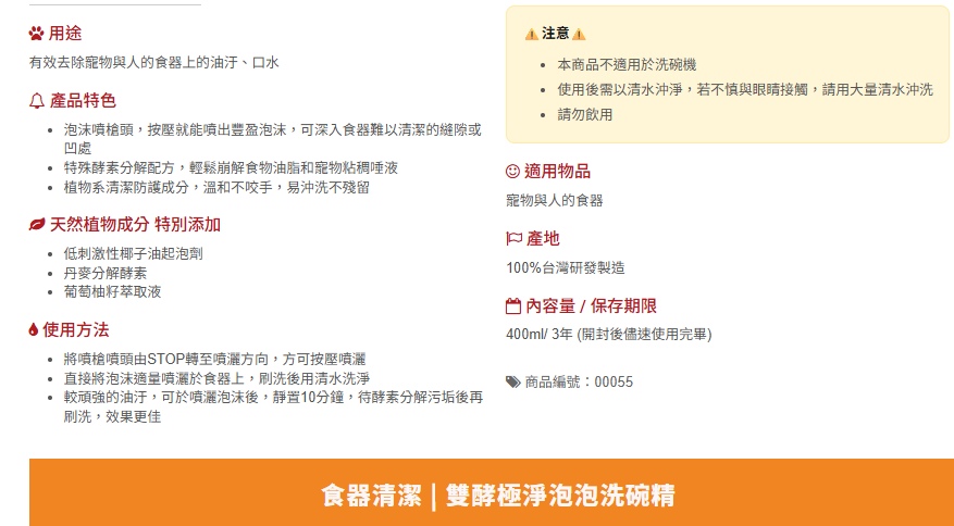 【毛起來】貓狗通用|植淨日常 雙酵極淨泡泡洗碗精 400ml