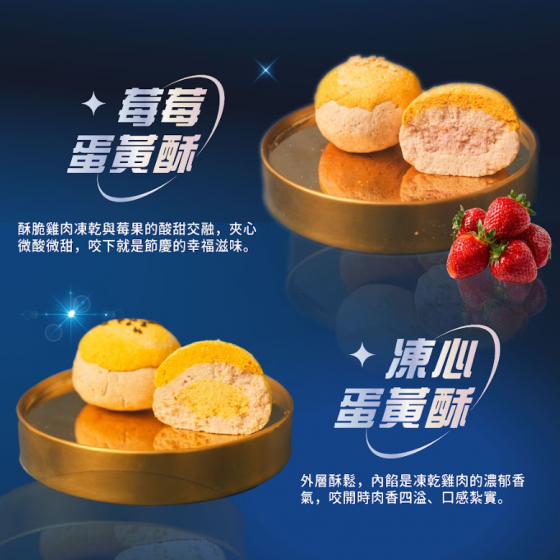 《內容物》 ⚈ 星際凍月餅 x 1入 ⚈ 凍心蛋黃酥 x 1入 ⚈ 莓莓蛋黃酥 x 1入 ⚈ 凍乾柚子酥 x 1入 ⚈ 月光燒肉盒 x 1入