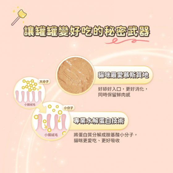 • 貓咪最愛-慕斯舔舔質地 • 好好吃!鮮甜海味雙拼+水解蛋白 • 好營養!維生素添加 • 好機能!泌尿x腸胃x呼吸道