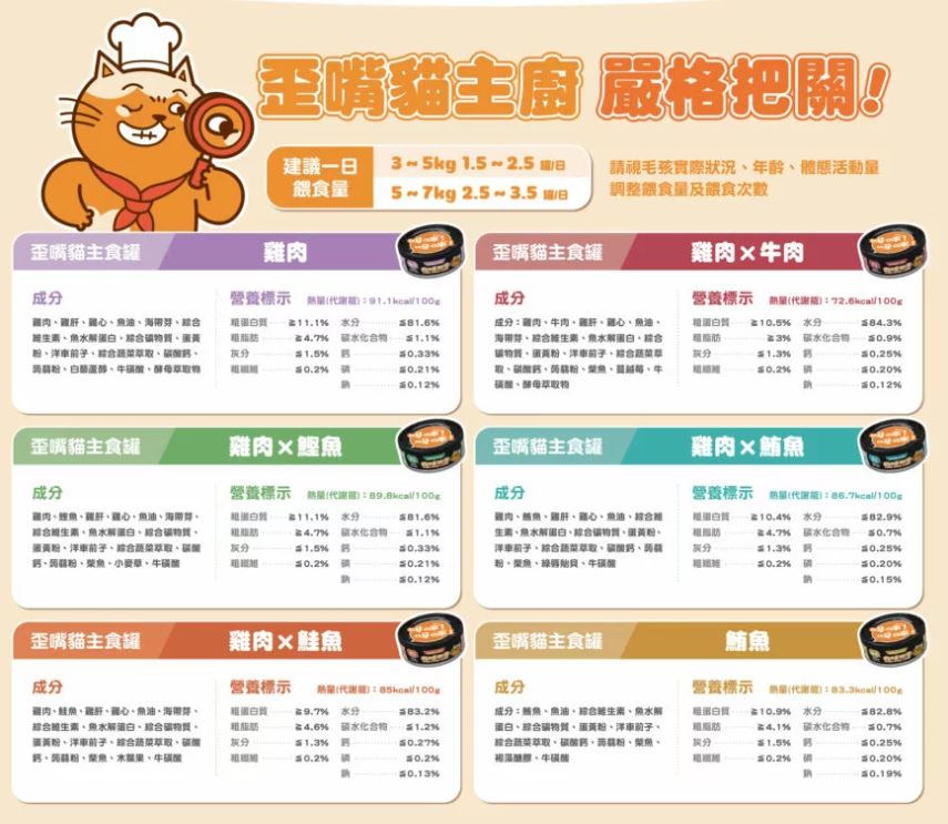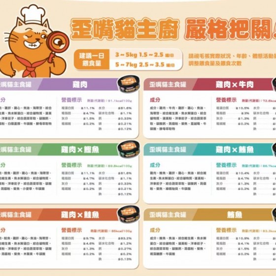 成分:雞肉、牛肉、雞肝、雞心、魚油、海帶芽、綜合維生素、魚水解蛋白、綜合礦物質、蛋黃粉、洋車前子、綜合蔬菜萃取、碳酸鈣、蒟蒻粉、柴魚、蔓越莓、牛磺酸、酵母萃取物肉球世界 歪嘴貓主食罐 80g 單罐