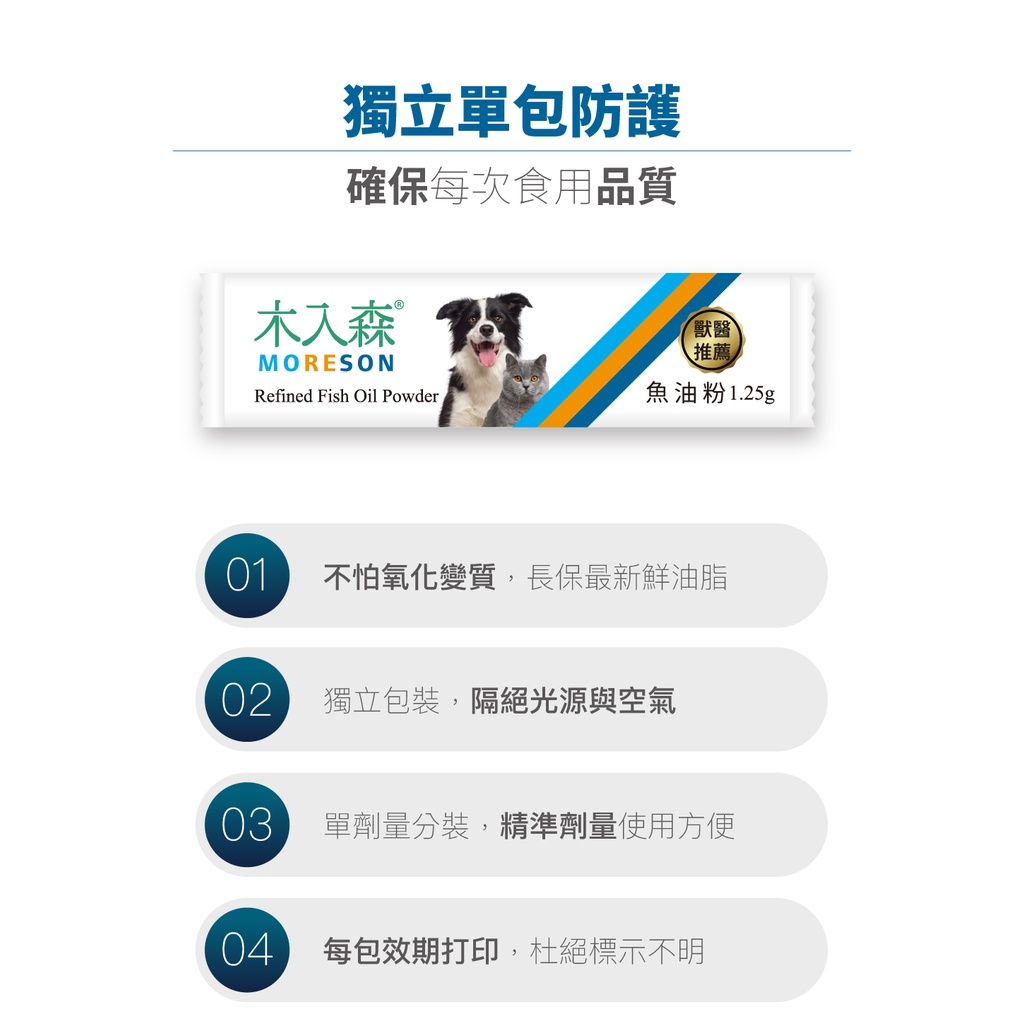 木入森魚油粉,有別於傳統魚油膠囊,是更適合貓咪狗狗的 Omega-3 營養來源,不只無腥味、適口性更高,餵食方便,專利「雙層包覆技術」還能完整新鮮保存魚油營養。