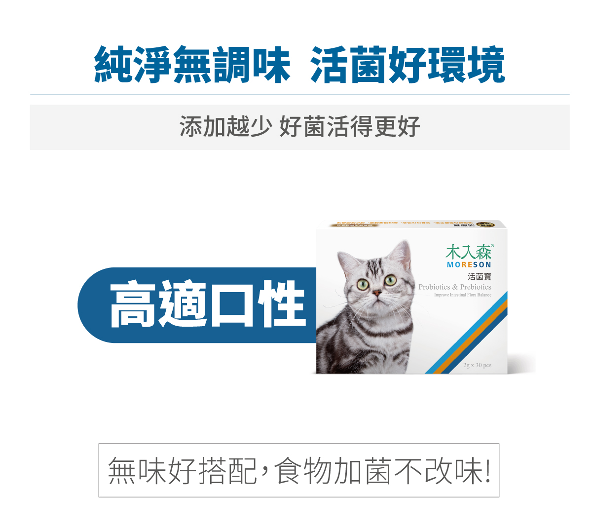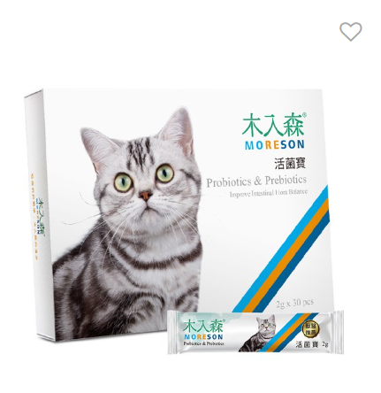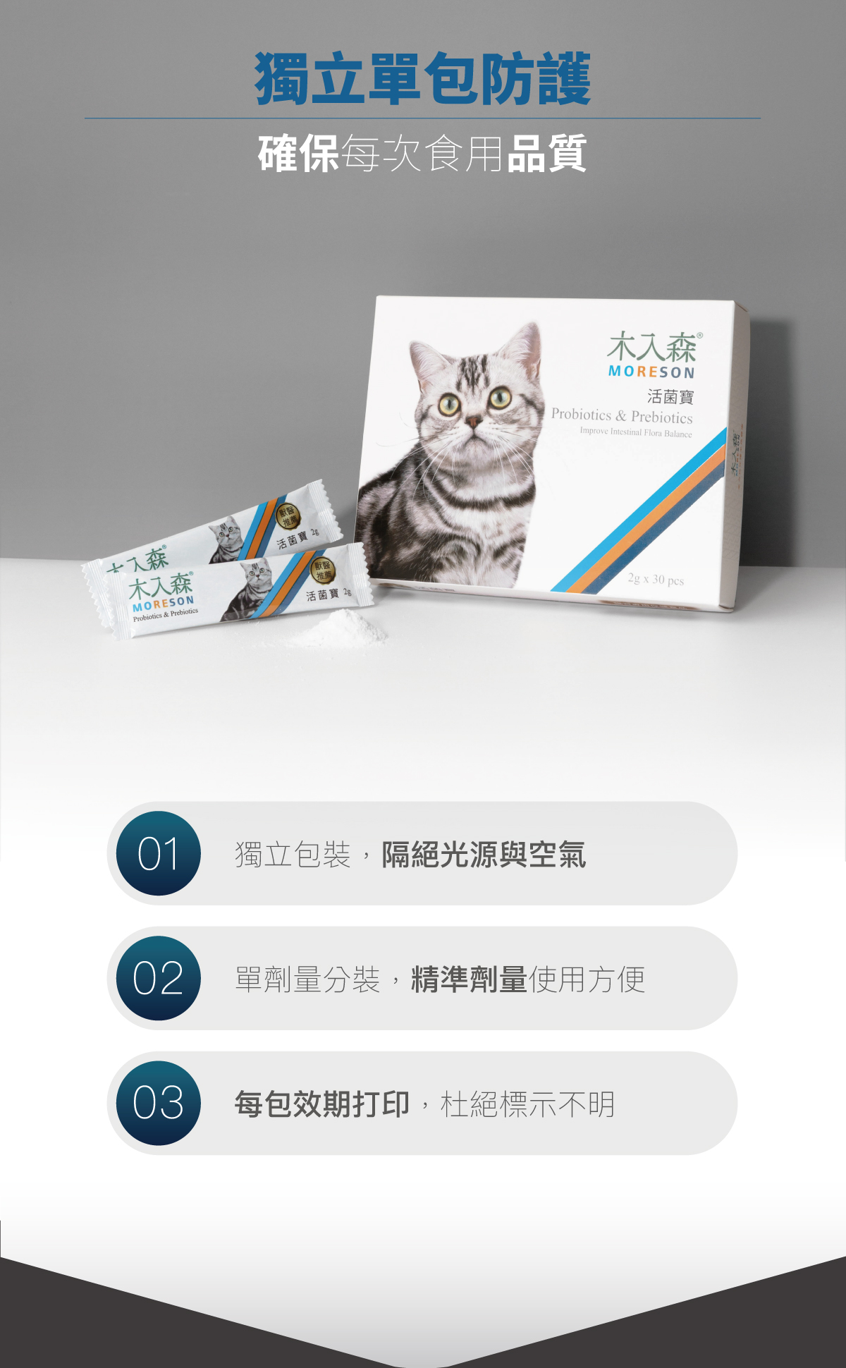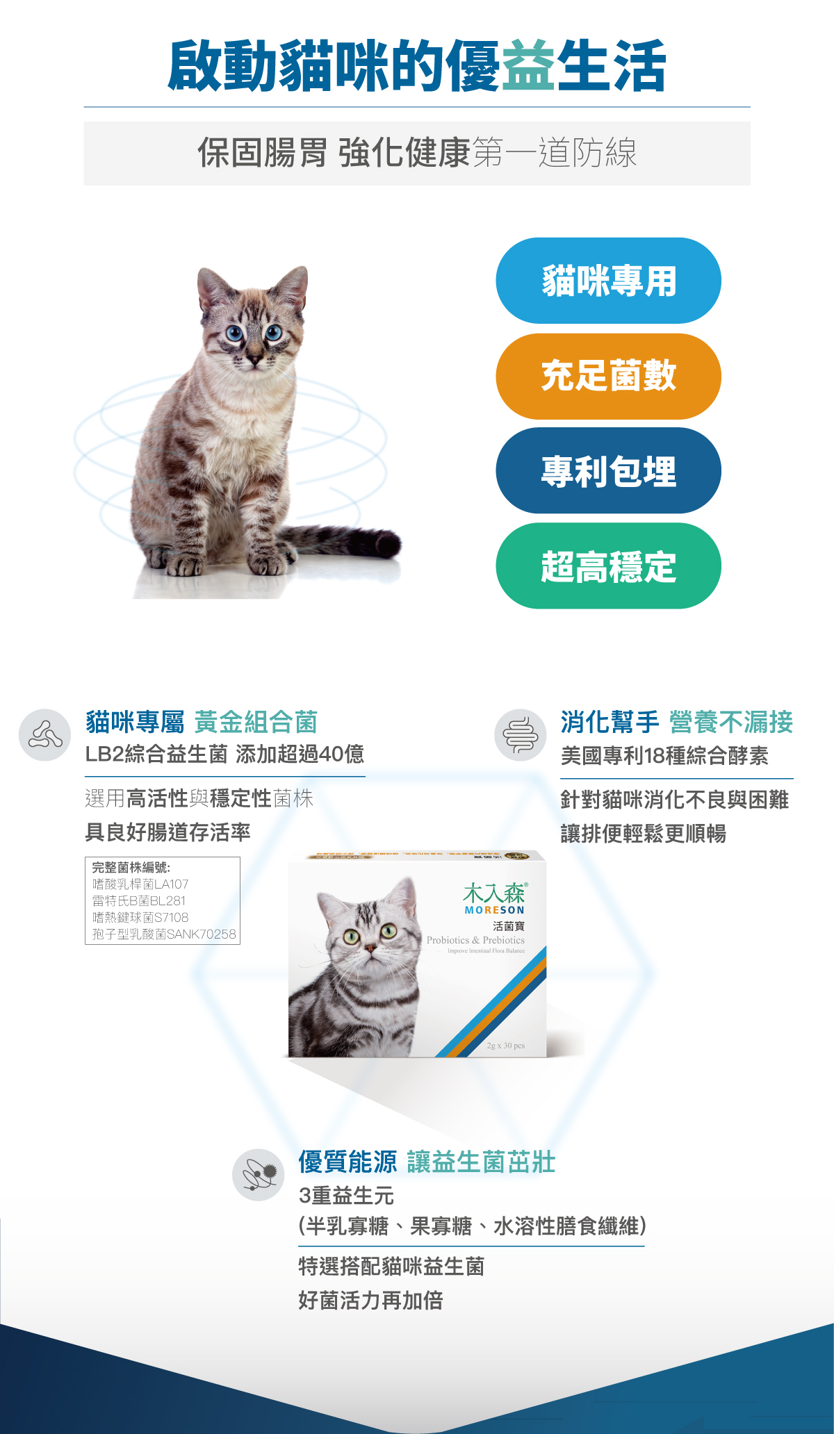 木入森貓咪活菌寶,給予貓咪專屬 LB2 綜合益生菌,有效調整細菌叢生態,搭配優質益生菌能源(半乳寡糖、果寡糖、水溶性膳食纖維),增進腸內菌叢品質,促進腸胃蠕動,使排便穩定正常,並使用美國專業 18 種類型綜合酵素,針對貓咪飲食,幫助消化。