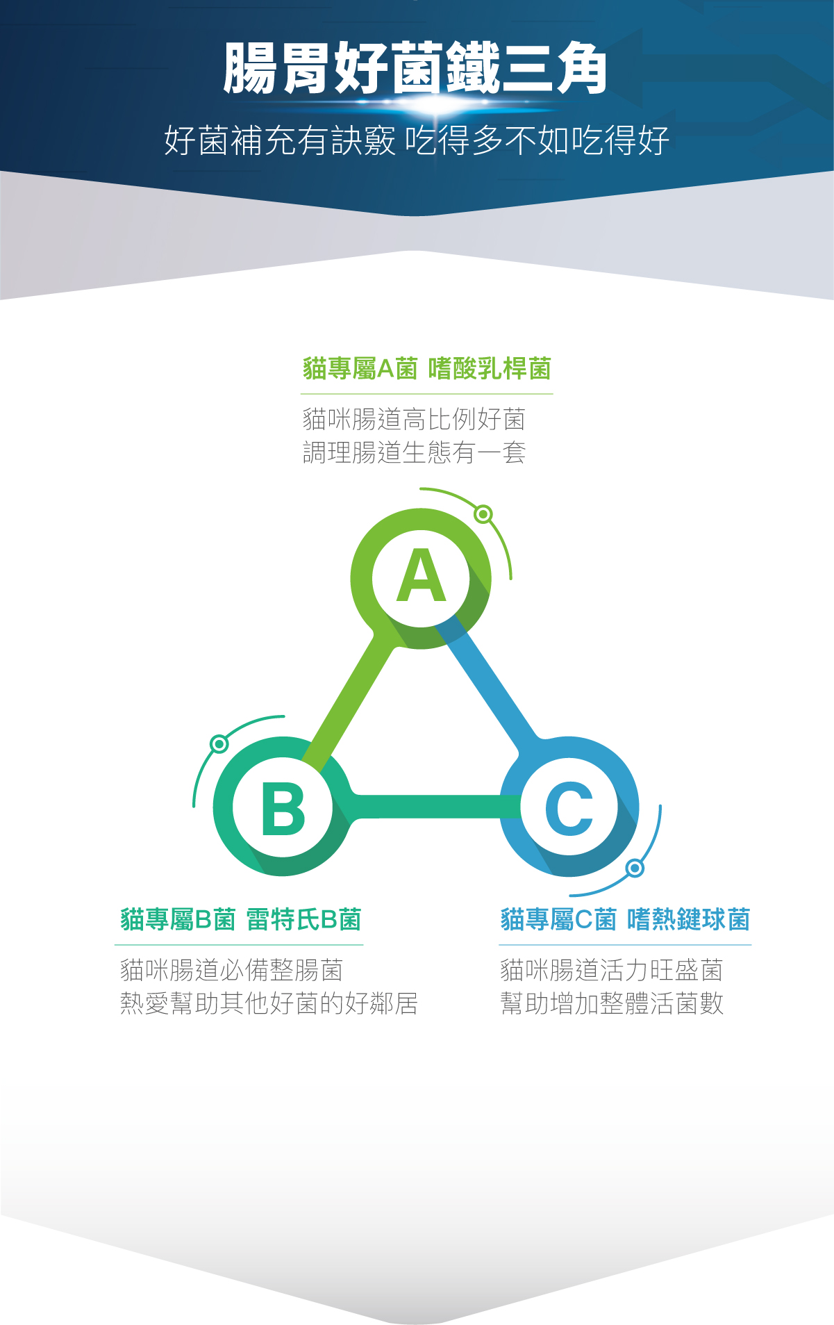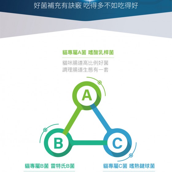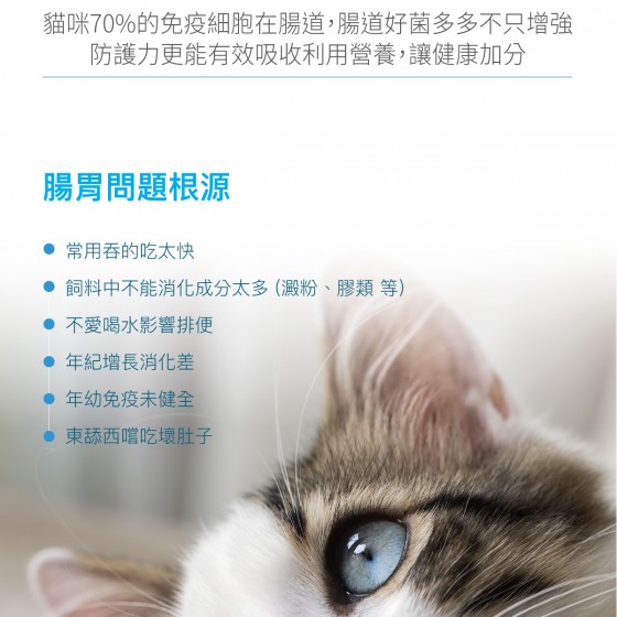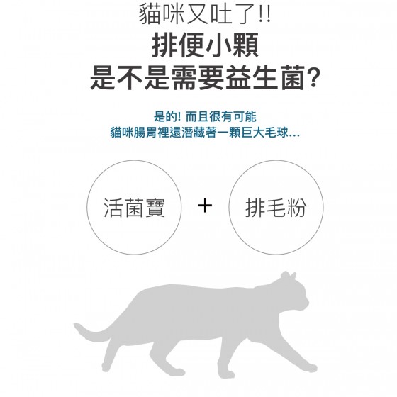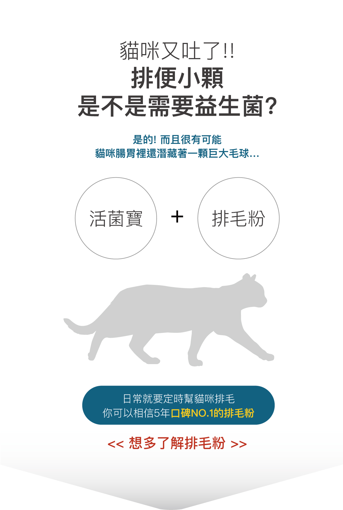 木入森貓咪活菌寶,給予貓咪專屬 LB2 綜合益生菌,有效調整細菌叢生態,搭配優質益生菌能源(半乳寡糖、果寡糖、水溶性膳食纖維),增進腸內菌叢品質,促進腸胃蠕動,使排便穩定正常,並使用美國專業 18 種類型綜合酵素,針對貓咪飲食,幫助消化。