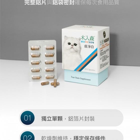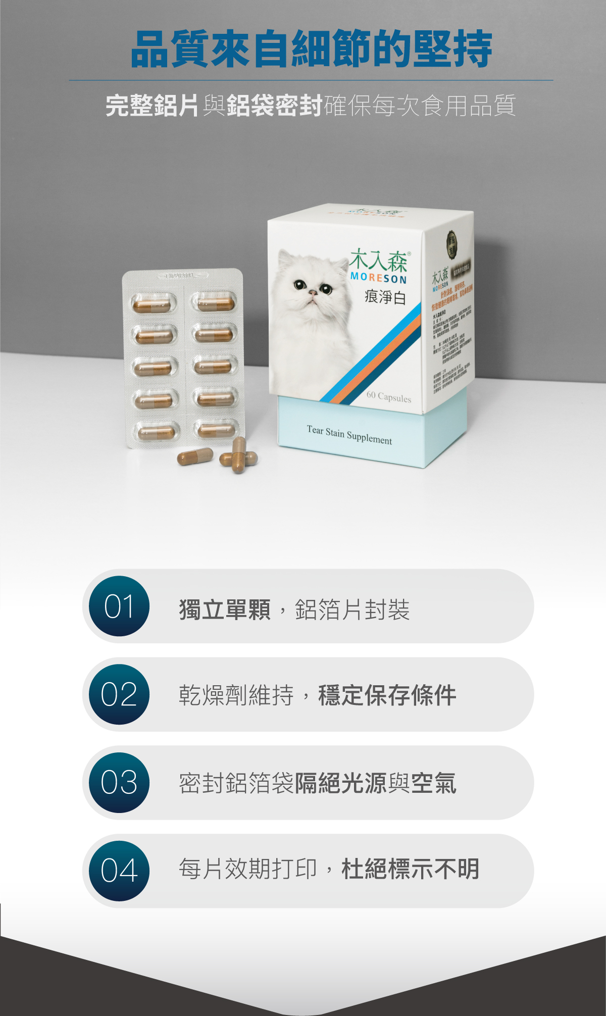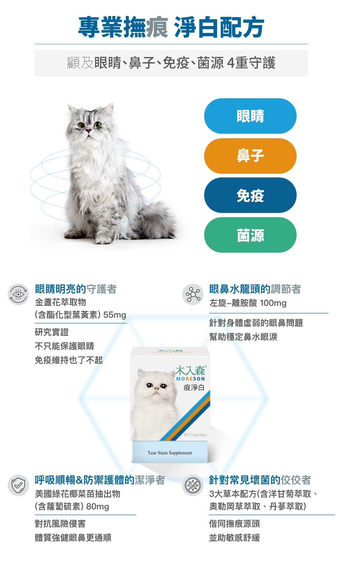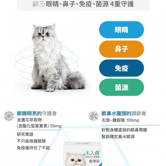 木入森 貓咪痕淨白,全面 4 大淨白營養,對付多重流淚原因,顧及眼睛、鼻子、免疫、菌源 4 重守護,具備強效抗氧化力,化減眼污累積,幫助呼吸順暢並助敏感舒緩。成分據研究證實,可幫助克服色素累積,達到淨白效果。