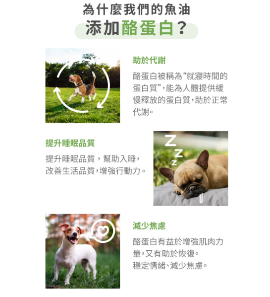 酪蛋白又稱就寢時間蛋白,進入體內以緩慢的速度釋放,幫助毛孩放鬆情緒、維持睡眠品質、舒緩焦慮。對於壓力敏感、常緊張、出現破壞行為的毛孩特別有幫助。