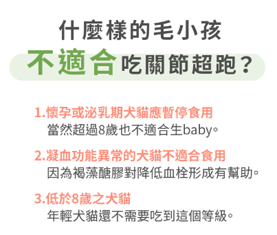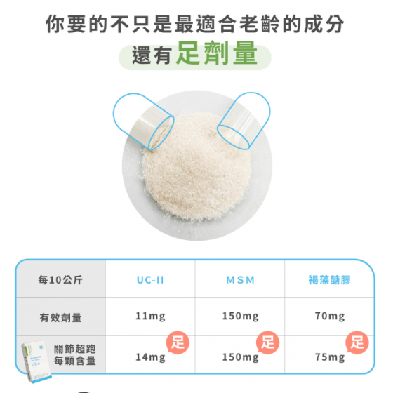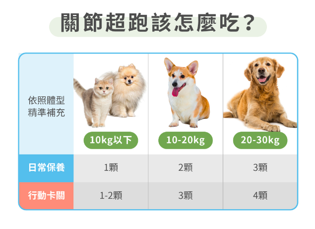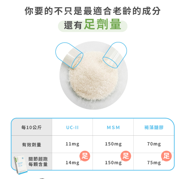 Q1:UC-II 跟葡萄糖胺、軟骨素差在哪裡? UC-II 屬於非變性第二型膠原蛋白,臨床研究顯示比傳統葡萄糖胺和軟骨素更容易吸收且效果更穩定。 嬌寵醫生關節超跑採用專利 UC-II 並搭配MSM、褐澡醣膠完整足劑量配方。 Q2:貓狗開過關節刀後可以吃關節超跑嗎? 可以!手術後更需補充足夠關節保健品來幫助骨關節及軟骨所需營養,極精萃關節超跑配方足劑量, 用最少成分達到最大功效,是毛孩關節術後保養首選。 Q3:狗狗走路卡卡適合吃關節超跑嗎? 狗狗走路卡卡、蹲下困難、爬樓梯不順等關節退化狀況都適用喔! Q4:貓咪才 5 歲但有折耳貓體質,現在需要吃關節超跑嗎? 像折耳貓、曼赤肯這類天生關節脆弱的品種,建議從5歲起開始進行保養,攝取關節保健品。 Q5:關節超跑可以天天吃嗎?要吃幾顆? 極精萃關節超跑選擇最適合毛孩成分,可以天天吃作為毛孩關節保健補給。 為了達到有效足劑量,請依照毛孩的體重餵食,10KG以下每天1顆,10-20KG每天2顆,20-30KG每天3顆。 Q6:我家毛孩剛滿8歲,想保養關節該選擇魚油還是關節超跑? 魚油富含EPA及DHA,可以舒緩關節不適,對於眼睛、皮膚、心血管也有全面幫助,適合全年齡毛孩身體保健。 關節超跑的三大成分UC-II、MSM、褐澡醣膠則可以幫助關節、軟骨、骨骼的健康及協同運作的靈活度,非常適合初老毛孩每日養護關節。