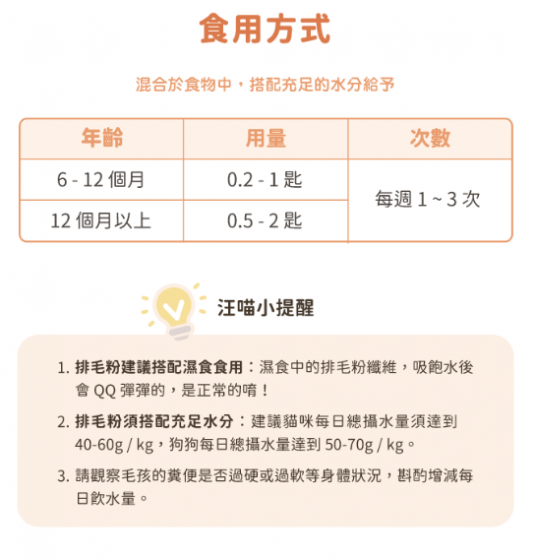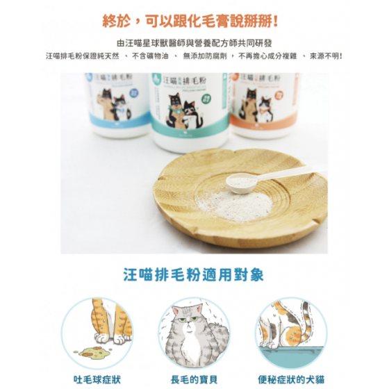 🅰️汪喵星球排毛粉成分為天然纖維與消化酵素、天然魚油&亞麻仁油,可幫助維持腸道健康及幫助糞便潤滑。雖然狗狗沒有頻繁舔毛的習性,但若玩耍時食入大量毛髮,還是可以補充排毛粉來幫助排除毛髮及幫助腸胃蠕動喔。