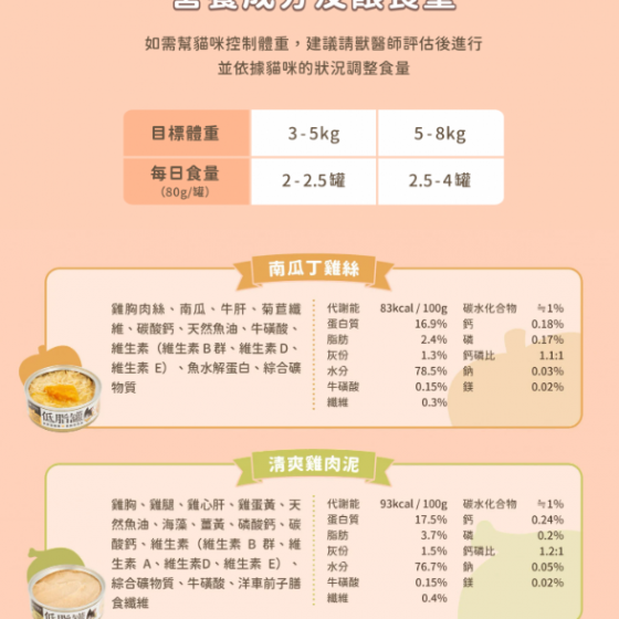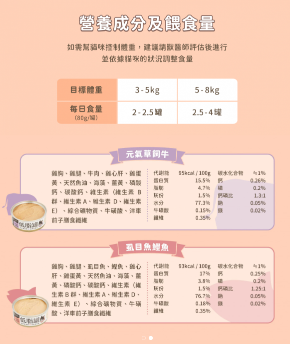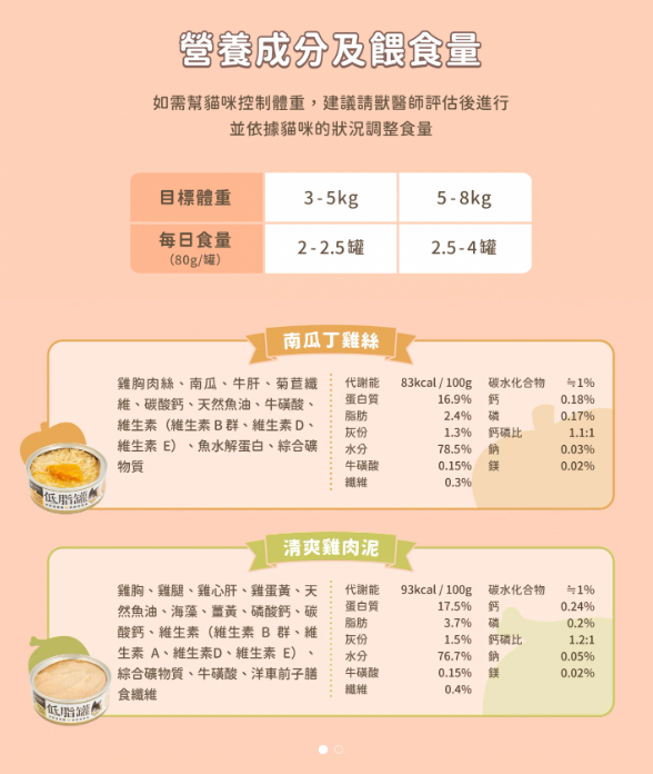 低脂罐依據 AAFCO/NRC 營養標準設計,正常體態的成貓可以跟日常主食搭配著吃,提早控制體重,維持好體態!特別推薦給胖胖貓,或是年紀大代謝變慢的老貓。