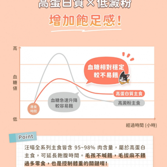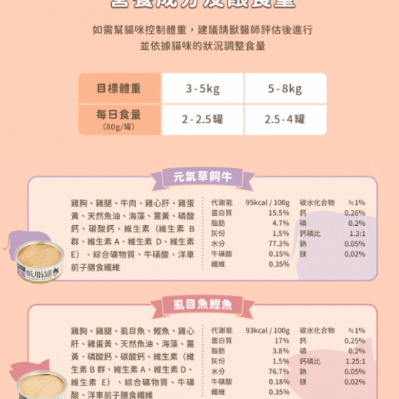 但如果是幼貓、手術後、懷孕哺乳貓,因為需要大量的能量就不太建議吃低脂罐,推薦吃 汪喵營養罐 補充能量;而如果有需要控制蛋白質攝取的貓咪,也比較不建議吃高蛋白的低脂罐,建議參考 低磷低蛋白主食罐 喔!