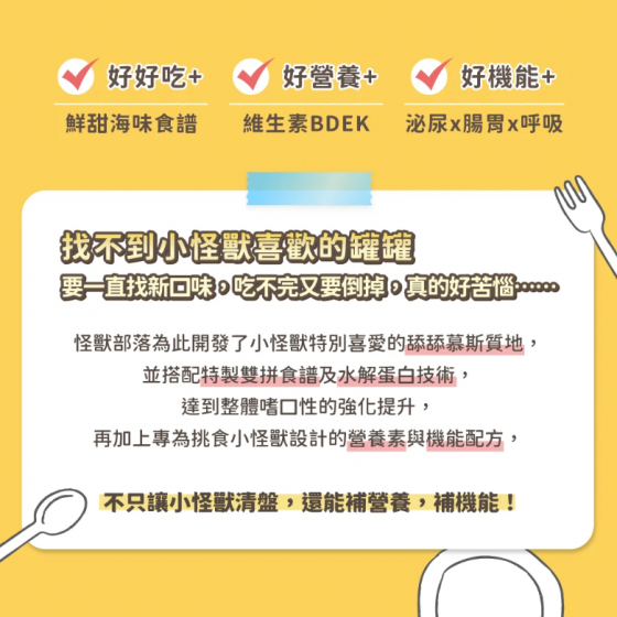• 貓咪最愛-慕斯舔舔質地 • 好好吃!鮮甜海味雙拼+水解蛋白 • 好營養!維生素添加 • 好機能!泌尿x腸胃x呼吸道