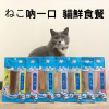 每天讓愛貓享受不同鮮食餐,九種口味: 鮪魚條、雞肉條、鮪魚肚、雞肉佐雞肝、鮪魚佐柴魚、雞肉佐起司、鯖魚條、雞肉蔓越莓、金槍魚條。