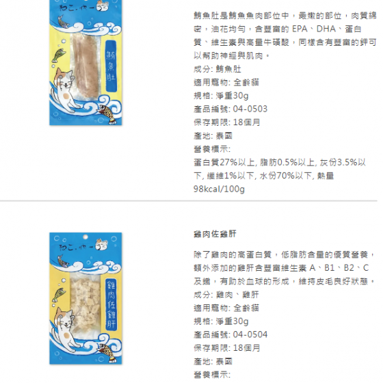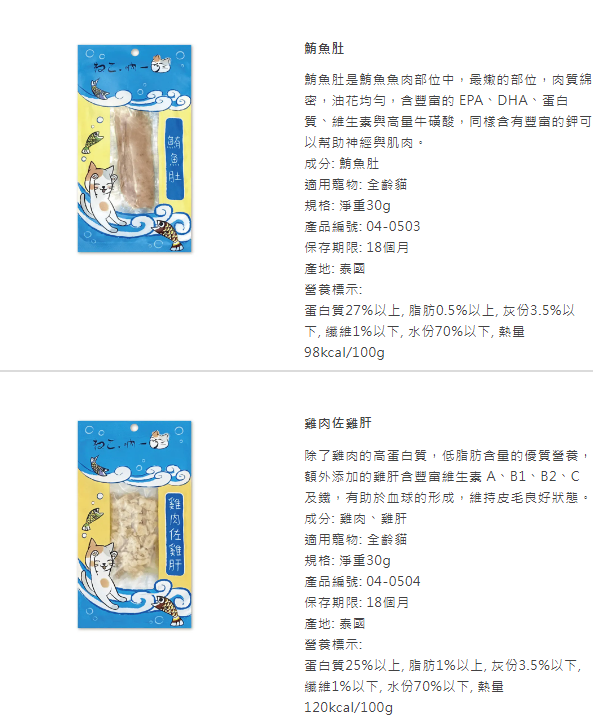 蛋白質31%以上, 脂肪0.4%以上, 灰份3%以下, 纖維1%以下, 水份68%以下, 熱量112kcal/100g鮪魚肚-吶一口貓鮮食餐-04-0503