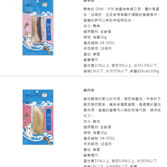 蛋白質21%以上, 脂肪3%以上, 灰份3.5%以下, 纖維1%以下, 水份75%以下, 熱量82kcal/100g雞肉條-吶一口貓鮮食餐-04-0502
