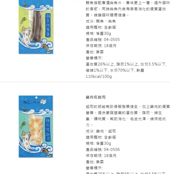 蛋白質25%以上, 脂肪1%以上, 灰份3.5%以下, 纖維1%以下, 水份70%以下, 熱量120kcal/100g鮪魚佐柴魚-吶一口貓鮮食餐-04-0505