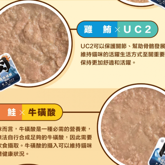 雞肉泥(生)、去皮清肉(熟)、鮪魚(生)、雞肝、雞心、雞軟骨粉、高麗菜、秋葵、燕麥、水、磷蝦油、紅花籽油、綜合礦物質、魚水解蛋白、牛磺酸、碳酸鈣、雞蛋黃、洋車前子、綜合疏菜、酵母萃取