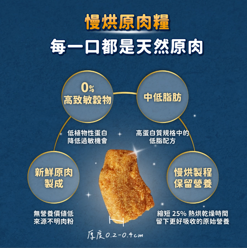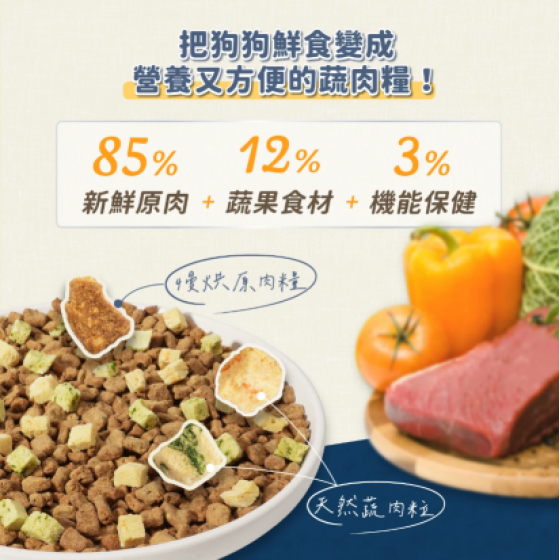 • 慢烘原肉糧+凍乾蔬肉粒,肉菜機能一次滿足!