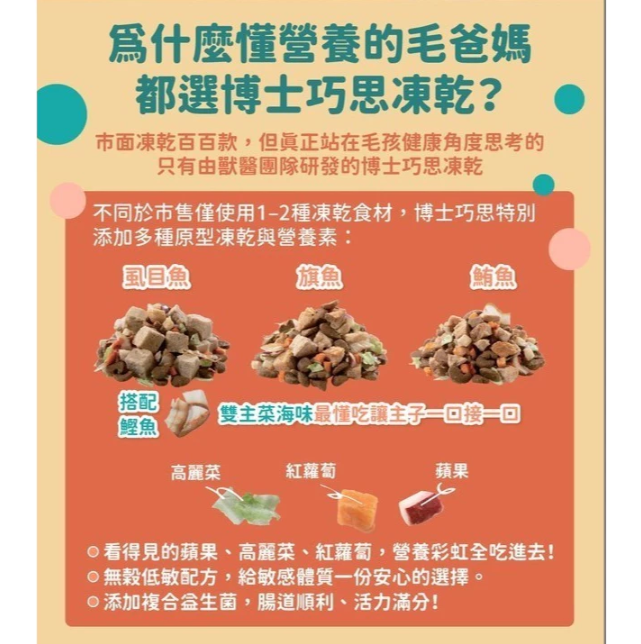 營養乾糧:脫水雞肉、脫水鯷魚、豌豆、馬鈴薯、家禽油脂(維生素E保存)、乾燥甜菜、乾燥海藻 酵母粉、牛磺酸、絲蘭萃取物、卵磷脂、複合益生菌(嗜乳酸桿菌、雙叉乳酸桿菌)、維生素A、維生 素D、維生素E、維生素B1、核黃素、維生素B6、維生素B12、菸鹼酸、氯化膽鹼、泛酸鈣、葉酸、生物 素、碘酸鈣、胺基酸鐵、胺基酸鋅、胺基酸銅、胺基酸錳、酵母硒。