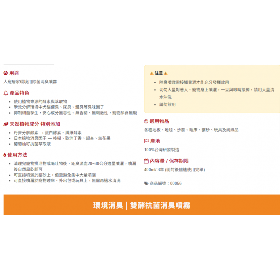 【毛起來】貓狗通用|植淨日常 雙酵抗菌消臭噴霧 400ml